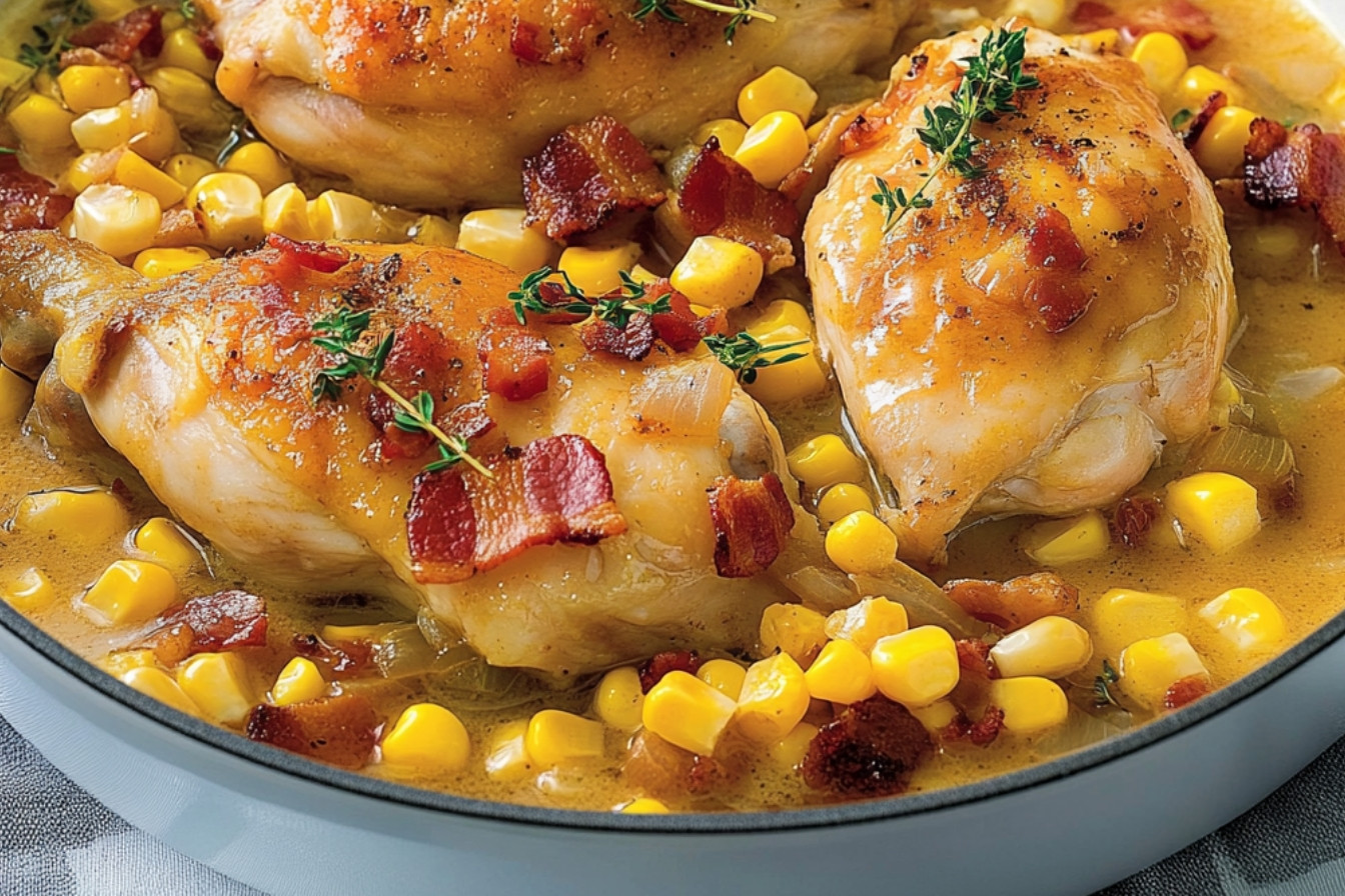 Braisé de poulet, maïs et bacon