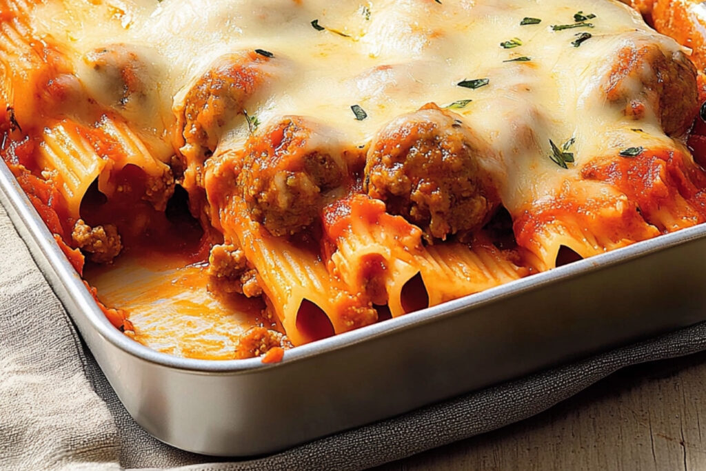 Dans un plat à four, disposez une couche de pâtes, suivie d’une couche de boulettes de viande, puis ajoutez de la sauce tomate et du fromage.