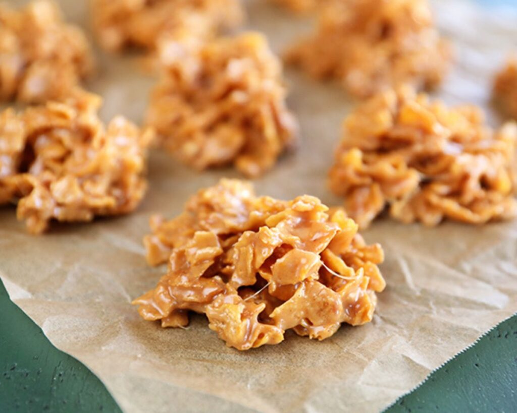 5. Une fois que les flocons de maïs sont bien enrobés, utilisez une grande cuillère à biscuits ou deux cuillères pour répartir le mélange sur du papier ciré ou du papier parchemin. Travaillez rapidement pour empêcher le mélange de se raffermir.