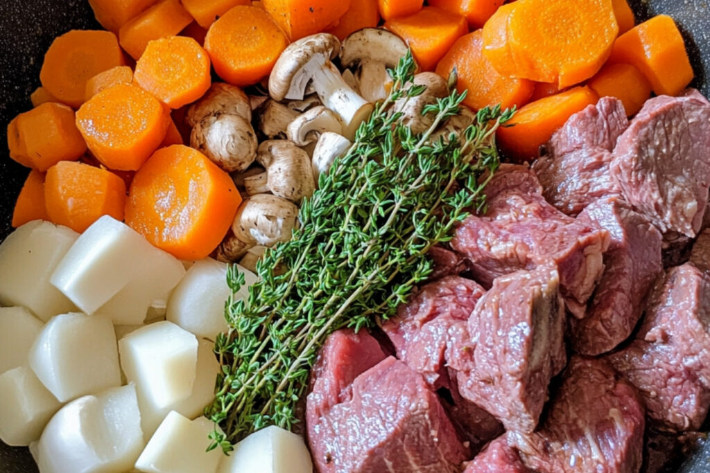 Découpez 1 kg de bœuf en morceaux de 3 cm. Épluchez et émincez 2 oignons. Coupez 2 carottes en rondelles.
