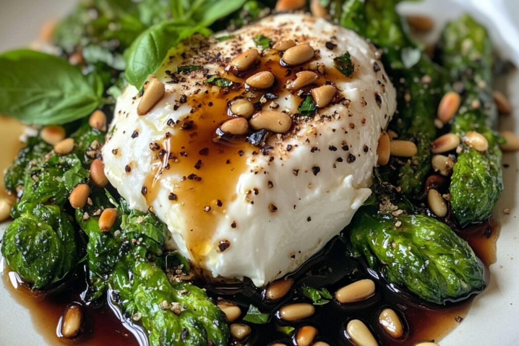 Disposez le broccolini refroidi sur un plat de service, ajoutez des morceaux de burrata et arrosez avec la vinaigrette balsamique.