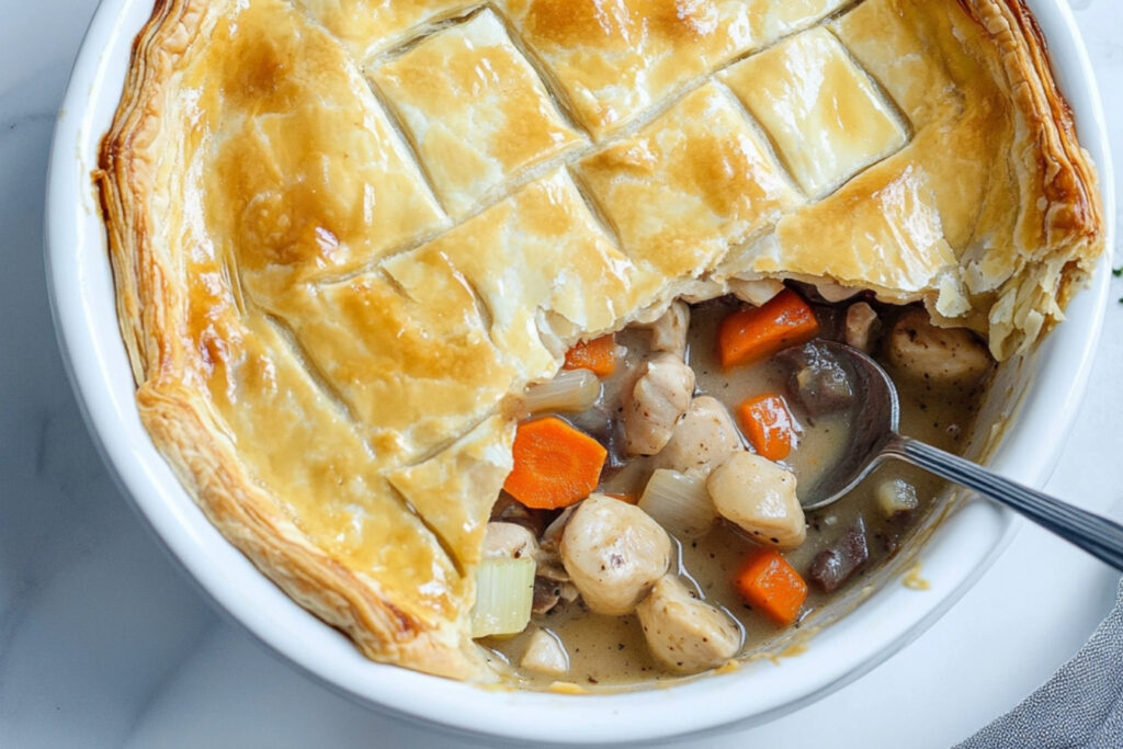 Transférez le mélange de poulet et de légumes dans un plat à tarte. Recouvrez avec la pâte et scellez les bords. Faites quelques incisions sur le dessus pour permettre à la vapeur de s’échapper.