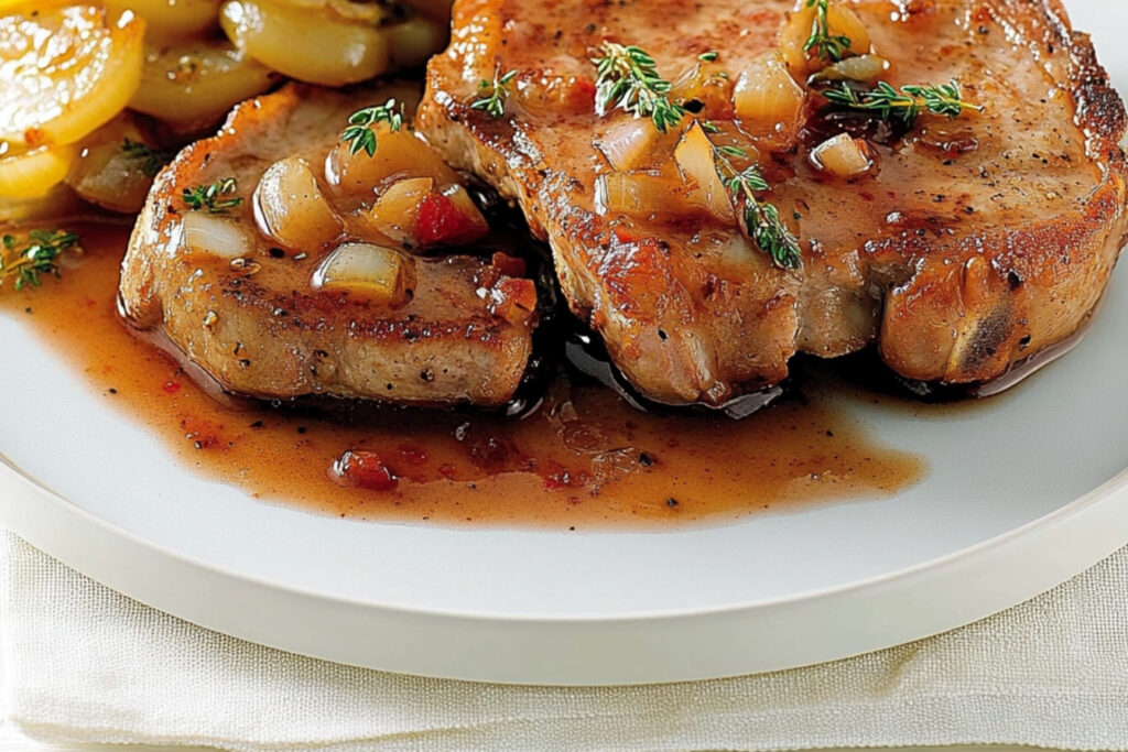 1. Servez les côtelettes de porc nappées de bouillon au vin rouge.