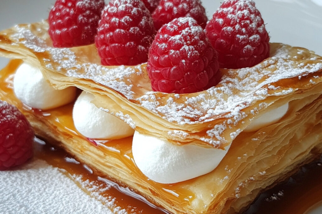 Pour un dessert encore plus attractif, servez les feuilletés sur un plat en ajoutant un filet de caramel et quelques framboises entières en décoration.