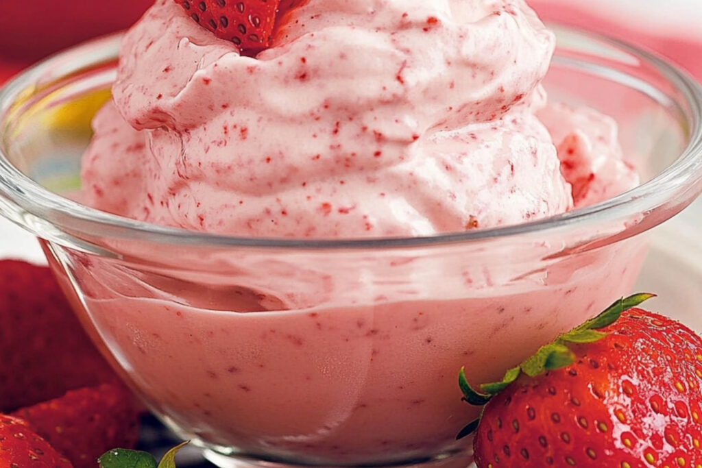 Ce gelato peut être servi avec des morceaux de fraises fraîches ou un coulis de fruits.