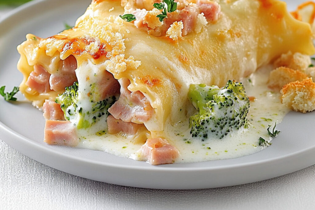 Étalez une feuille de lasagne sur une surface plane. Ajoutez une couche du mélange de jambon et brocoli, puis roulez doucement la lasagne sur elle-même. Répétez l’opération pour toutes les feuilles.
