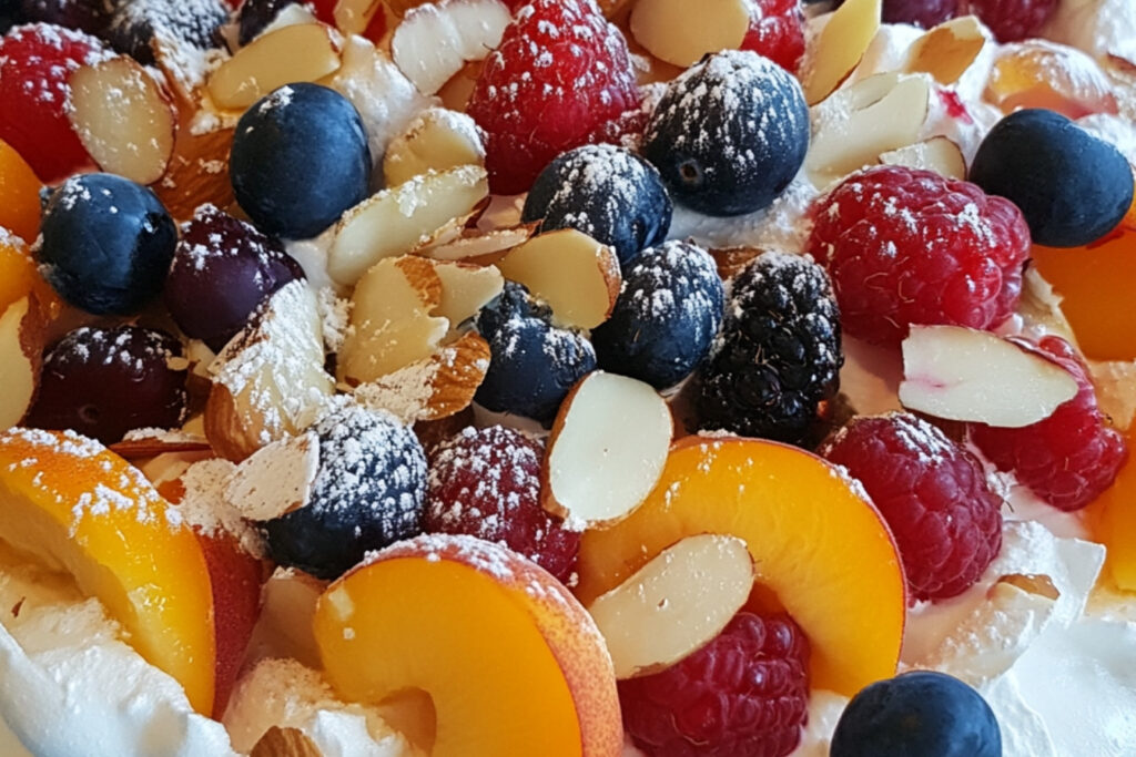Une fois les pavlovas complètement refroidies, garnissez-les de la crème d’amande, puis ajoutez vos fruits d’été préférés sur le dessus.
