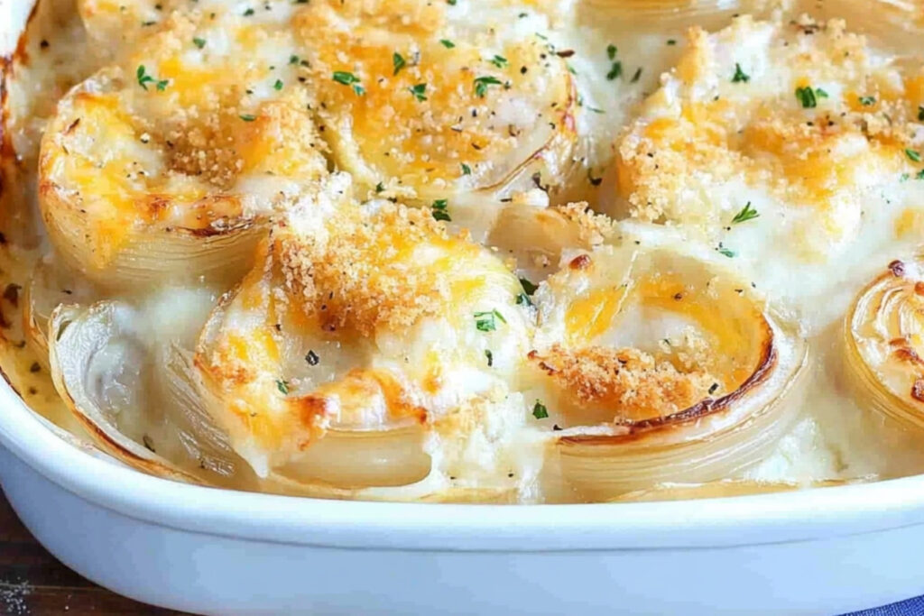 Incorporez des oignons cheesy en couches dans vos pommes de terre gratinées pour un plat réconfortant.