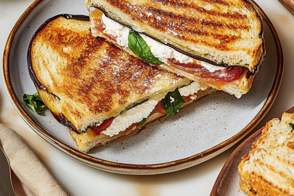 Assembler le paniniSur une tranche de pain, étaler une couche de sauce tomate, ajouter des tranches d’aubergine, une poignée de fromage ricotta ou de mozzarella, et compléter avec une autre tranche de pain. |
