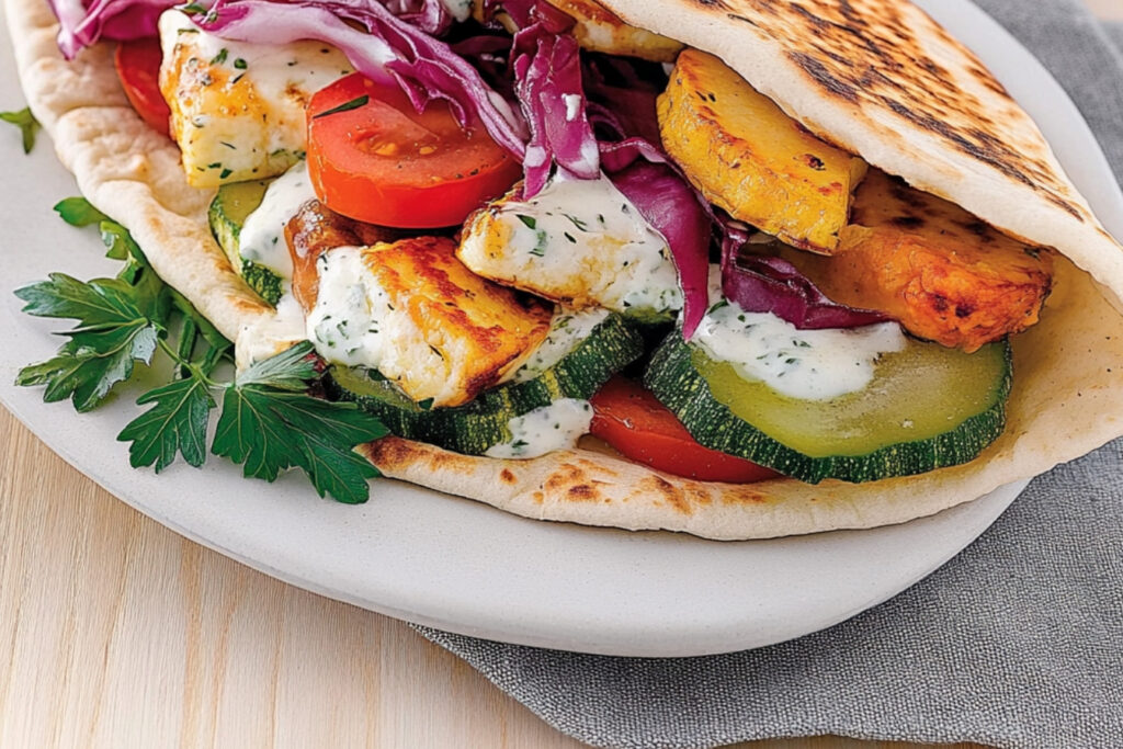 Dégustez vos pitas aux légumes et halloumi chaudes, accompagnées d’une sauce au yaourt ou d’une salade pour un repas équilibré et nutritif.