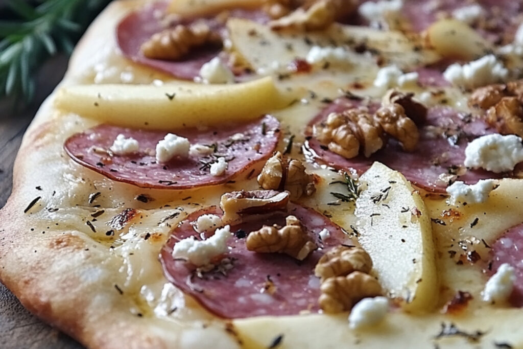La pizza est l’un de ces plats qui s’adapte facilement à tous les goûts et à toutes les envies. Pour cette recette, nous allons combiner des saveurs sucrées et salées grâce à l’ajout de pommes, de mortadelle, de noix et de fromage de chèvre. Ce mélange audacieux promet de ravir vos papilles et de donner une touche originale à votre table.