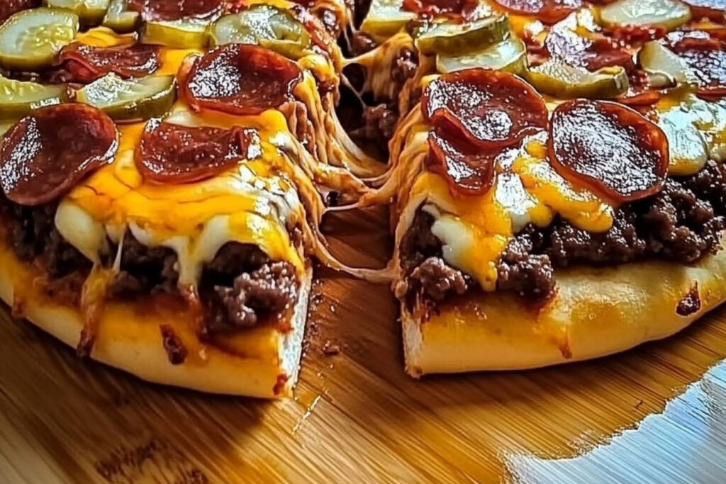 La pizza géante au burger, composée de viande, de fromage et de tranches de bacon, est un plat irrésistible qui allie le meilleur des deux mondes : le burger et la pizza. C’est un choix parfait pour les fêtes, les soirées entre amis ou simplement pour satisfaire une envie gourmande. N’hésitez pas à personnaliser cette recette selon vos préférences et à expérimenter avec différents ingrédients pour créer votre propre version unique.