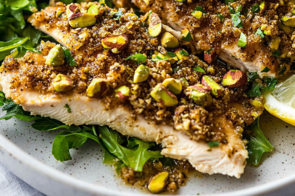 Enrober le poulet de pistaches hachées crée une croûte croustillante. Assurez-vous de bien presser les pistaches sur la viande pour qu’elles adhèrent pendant la cuisson.