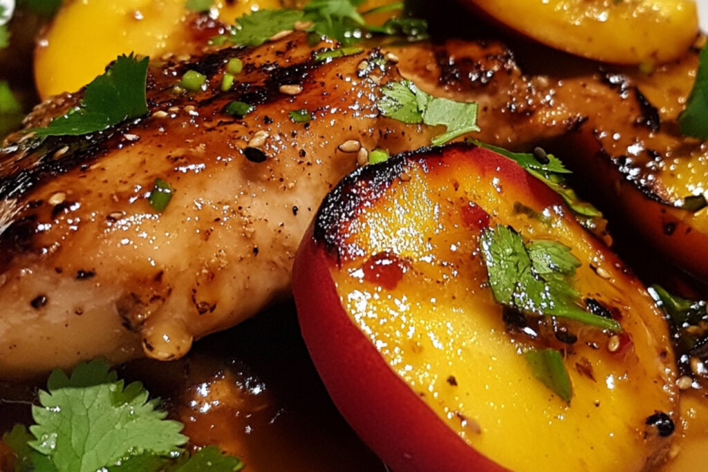 Poulet grillé au miel et à l’ail avec pêches et piments marinés