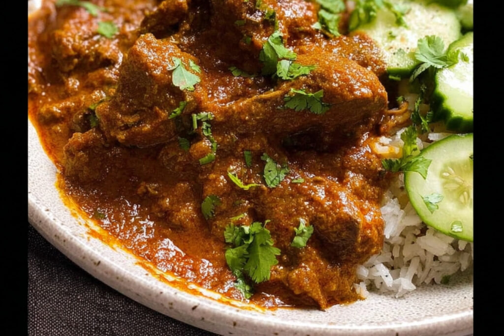 C’est un plat de curry d’origine indienne, généralement à base d’agneau, aromatisé avec des épices spécifiques de la région.