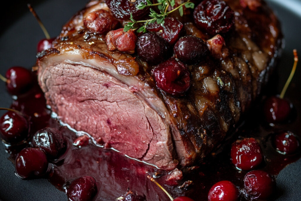 Une fois que le rôti est cuit, sortez-le du four et laissez-le reposer quelques minutes avant de le trancher. Servez les tranches de rôti accompagnées de la sauce aux cerises.