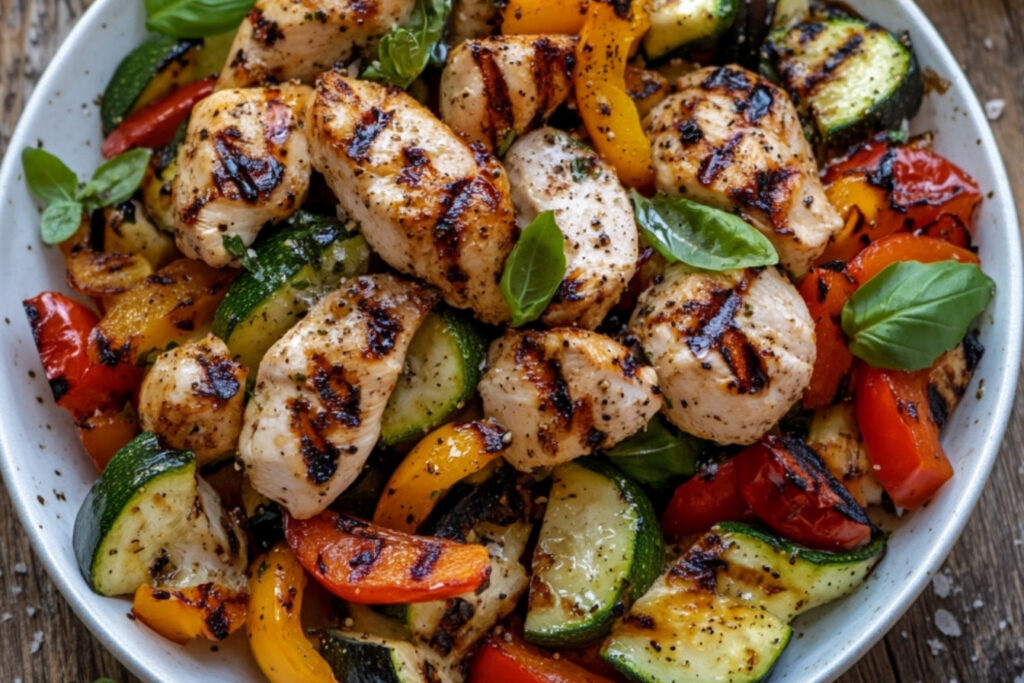 Dans un grand bol, mélangez les légumes grillés avec des morceaux de poulet tranchés. Ajoutez la vinaigrette de votre choix et mélangez délicatement.