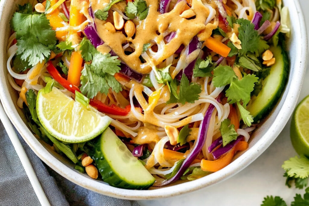 Dans un grand bol, combinez les nouilles cuites avec des légumes frais, tels que des carottes, des concombres et des herbes. Ajoutez ensuite la sauce aux cacahuètes et mélangez bien.