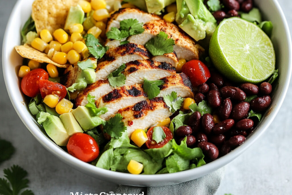 Transformez votre salade en un bol de burrito en ajoutant du riz, des haricots noirs, des maïs, et une touche de salsa. Cette version copieuse satisfera les amateurs de cuisine mexicaine.