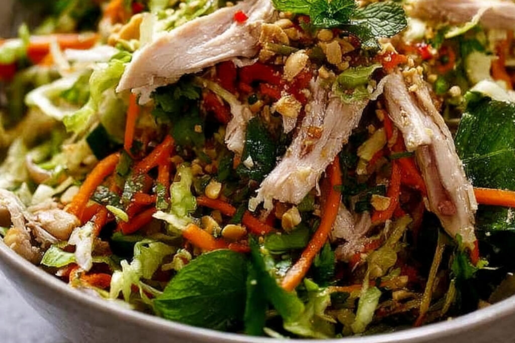 Cette salade de poulet vietnamienne est une explosion de saveurs et de textures, parfaite pour une entrée légère ou un plat principal. Sa combinaison d’ingrédients frais et son assaisonnement vibrant en font un repas nourrissant et satisfaisant. Que vous choisissiez de la servir lors d’une occasion spéciale ou simplement pour vous faire plaisir, cette recette apportera une touche d’exotisme à votre table.