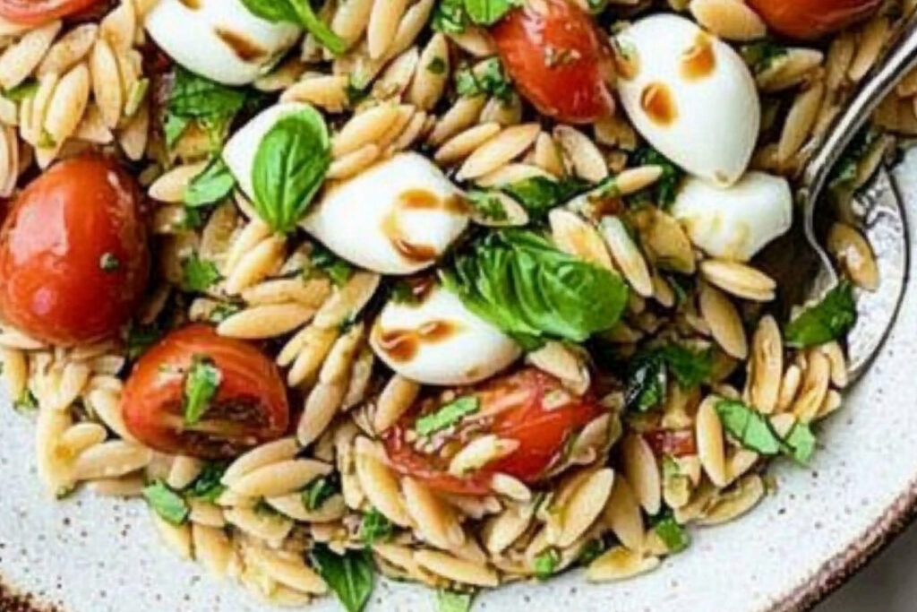 La salade Caprese Orzo se conserve bien au réfrigérateur jusqu’à 3 jours.