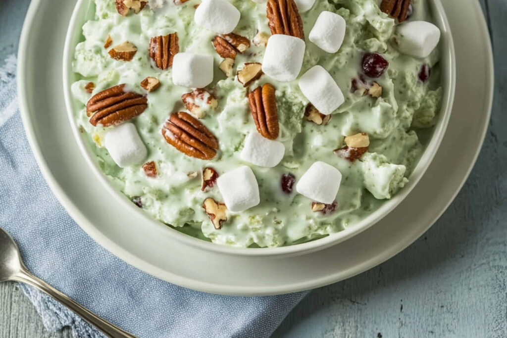 La salade Watergate est un mélange sucré à base de pistaches, de fruits, de noix et de crème fouettée, souvent servie comme dessert ou accompagnement.