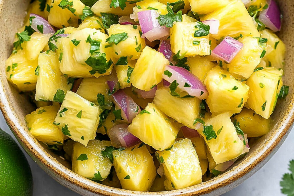 Cette recette de salsa d’ananas donne environ 4 portions, idéale pour un apéritif ou un accompagnement.
