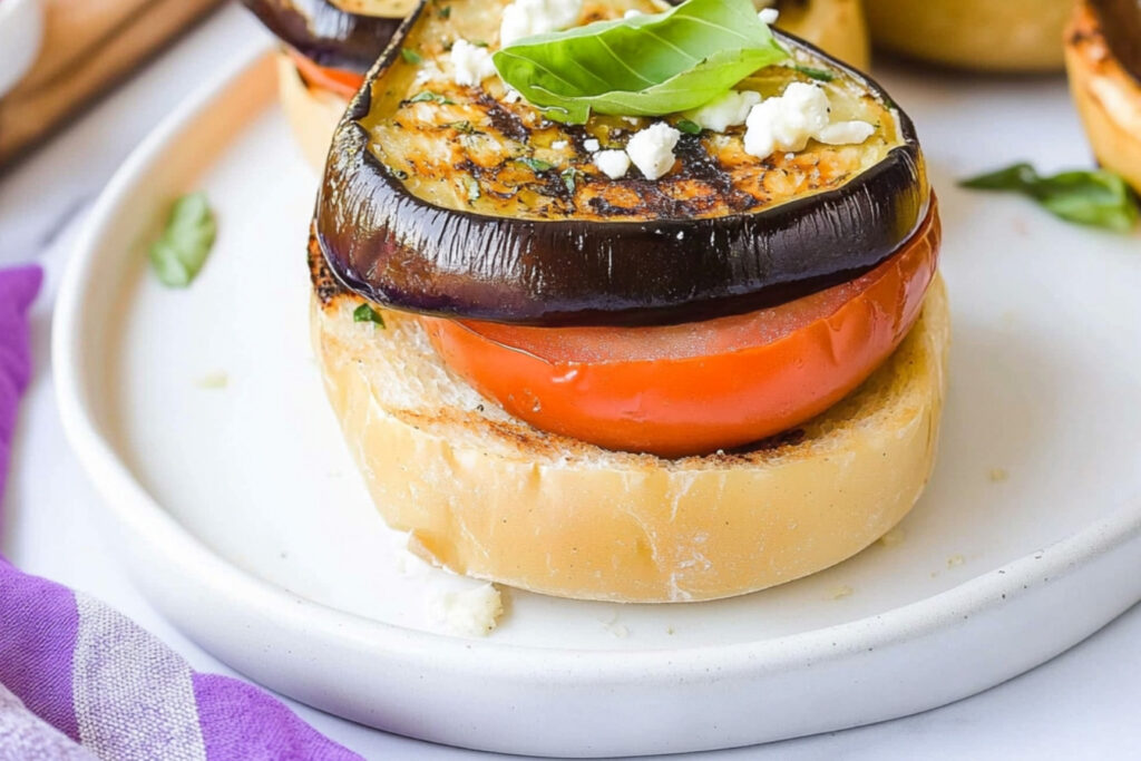 Pour assembler les sandwichs, placez une couche d’aubergine grillée sur une tranche de pain, ajoutez des tomates fraîches et le fromage de chèvre, puis recouvrez avec une autre tranche de pain.