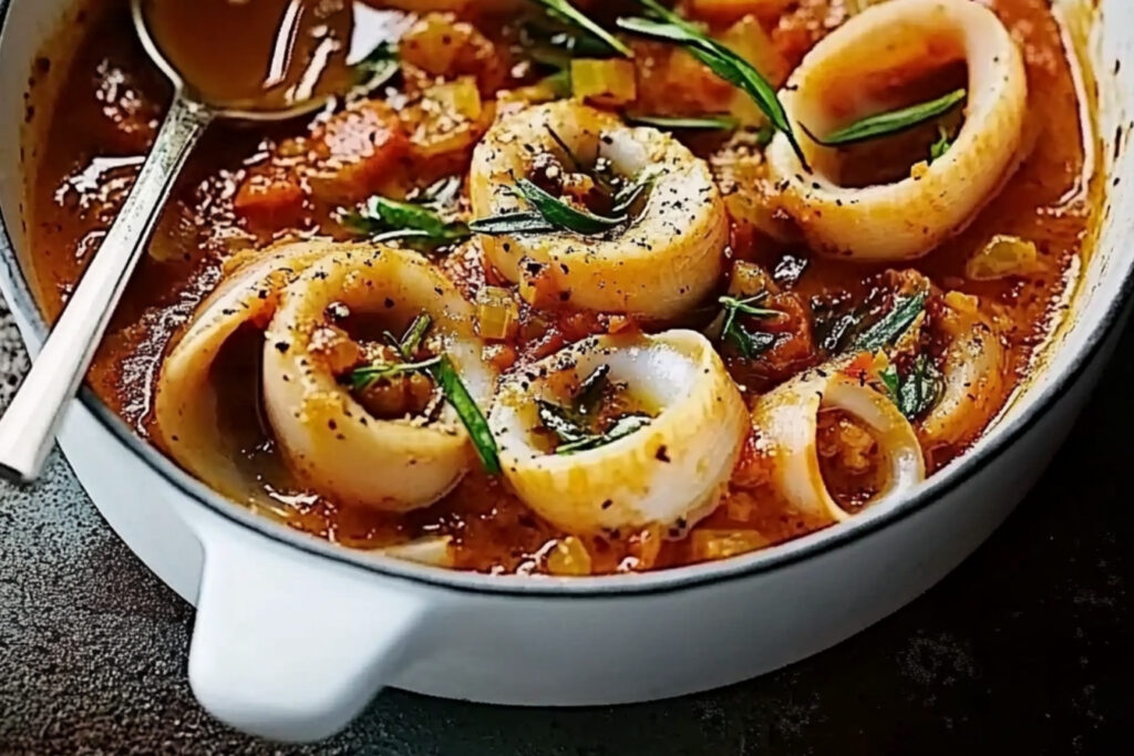 Servez la sauce à l’armoricaine avec des calmars dans des assiettes creuses pour mettre en valeur le plat.