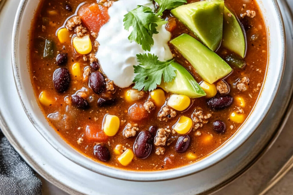 Cette soupe de tacos est un plat réconfortant et savoureux qui se prépare rapidement et facilement. C’est une excellente option pour les soirs de semaine chargés ou pour les repas entre amis. Les saveurs mexicaines généreuses et les ingrédients frais en font un choix populaire pour toute la famille.