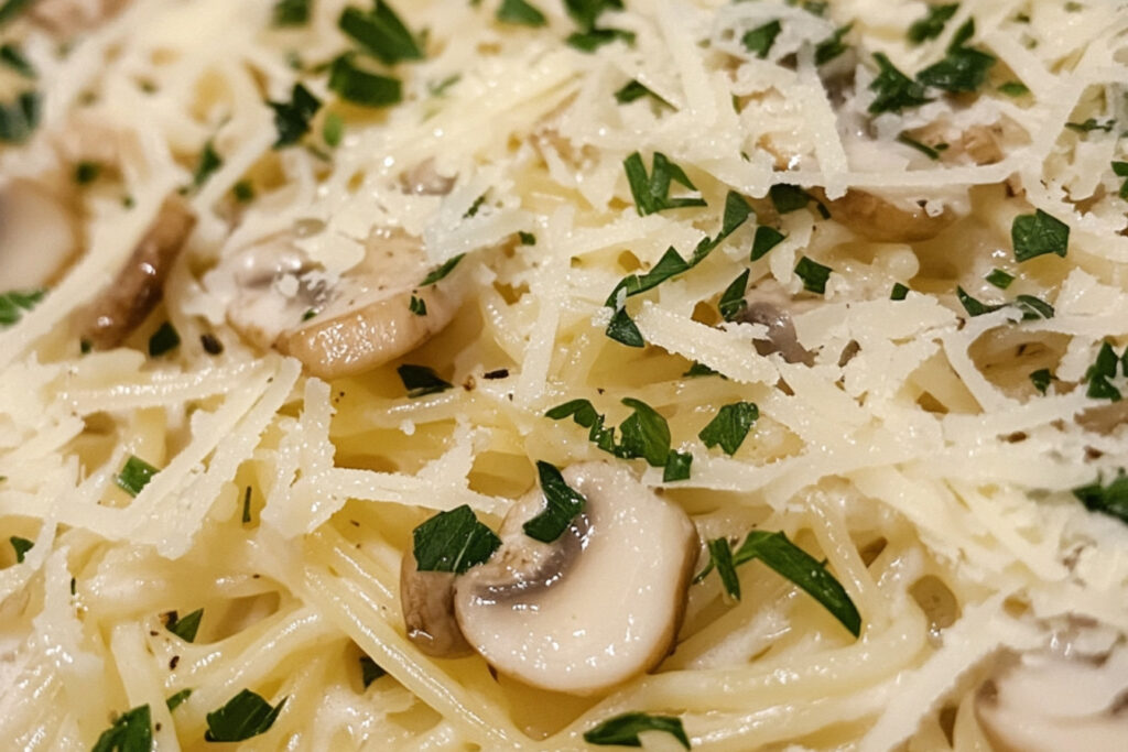 Une fois les pâtes cuites, égouttez-les et incorporez-les dans la poêle avec les champignons. Ajoutez la crème fraîche et mélangez bien pour enrober les pâtes.