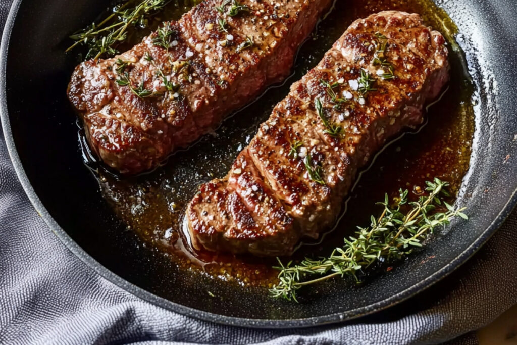 Après avoir saisi le steak, transférez la poêle dans le four préchauffé pour terminer la cuisson. Cela permet de cuire le steak à l’intérieur tout en maintenant l’extérieur croquant.