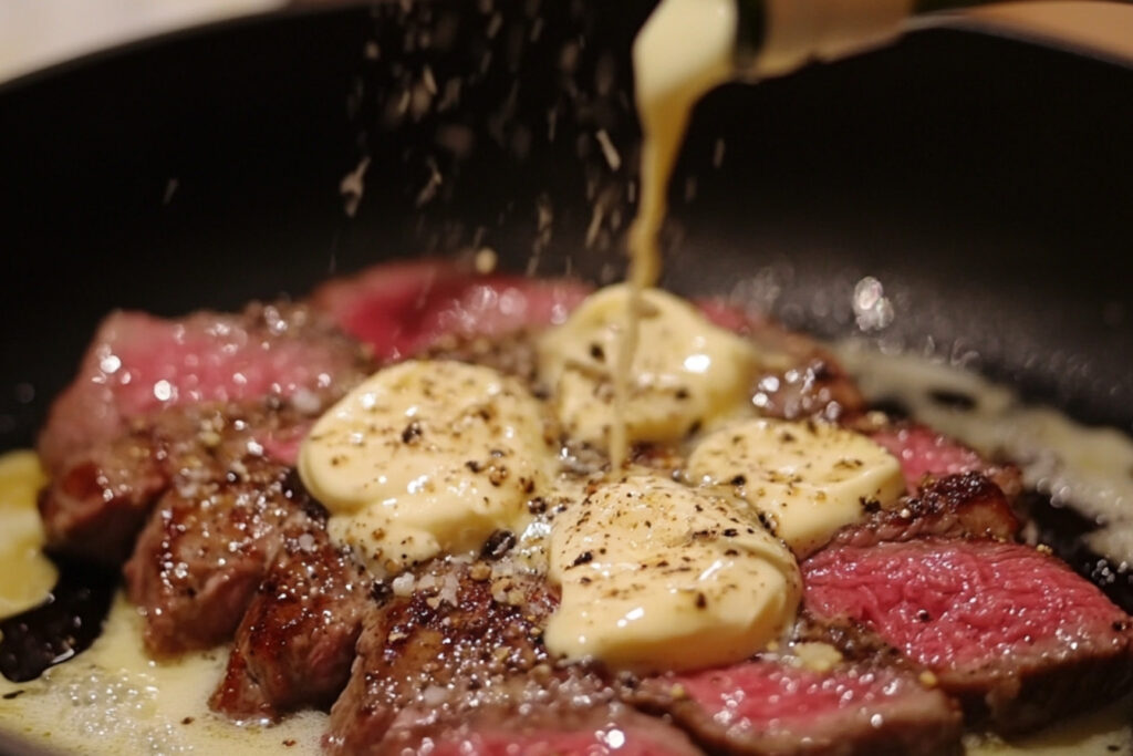 Remettez les steaks dans la poêle avec la sauce pour les enrober. Laissez cuire encore une minute pour que tout soit bien chaud.