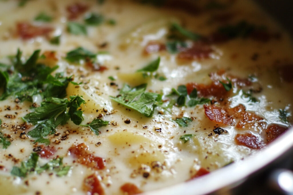 Incorporez les lardons réservés dans le velouté et mélangez. Rectifiez l’assaisonnement avec du sel et du poivre selon votre goût.