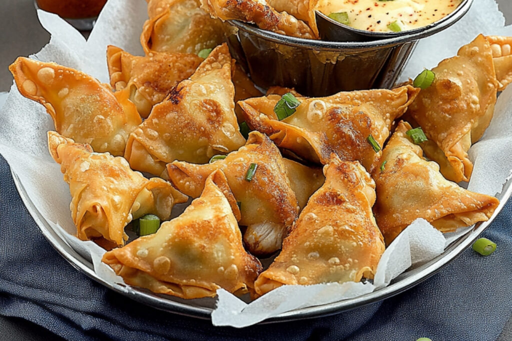Les wontons peuvent être préparés en remplissant des feuilles de pâte avec un mélange de poulet et de fromage, puis en les plissant et en les scellant.