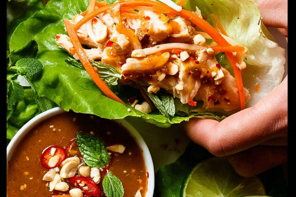 Servir les wraps de laitue avec un bol de sauce aux cacahuètes à côté pour le trempage.
